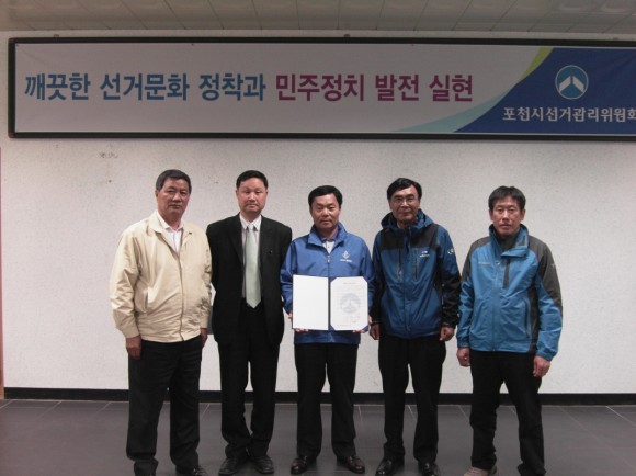 ÀÌ¿¡ ¾Õ¼ À̵é 5¸íÀÇ È帵éÀº Áö³ 15ÀÏ ¿ÀÈÄ Æ÷õ½Ã¼±°Å°ü¸®À§¿øÈ¸(À§¿øÀå ±èÁ¤»ï)¿¡¼ ¸¶·ÃÇÑ ¸Å´ÏÆä½ºÅä Á¤Ã¥¼±°Å ½ÇõÇù¾à½Ä¿¡ Âü¼®Çß´Ù.