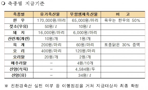 Áö±Þ´ë»ó ÃàÁ¾Àº ±Ý³âºÎÅÍ ¸ÞÃ߸®¾Ë, »ê¾ç(½ÄÀ°, À¯)ÀÌ Ãß°¡µÇ¾î ÇÑ¿ì, Á¥¼Ò(¿ìÀ¯), µÅÁö, »ê¶õ°è(´Þ°¿), À°°è, ¿À¸®, ¿À¸®¾Ë, ¸ÞÃ߸®¾Ë, »ê¾ç(½ÄÀ°, À¯)µî ÃÑ 9°³ Á¾ÀÌ¸ç »ç¾÷´ë»óÀÚ¼±Á¤Àº ¿¹»ê¹üÀ§ ³»¿¡¼ »ç¾÷½ÅûÀÚ Áß Ä£È¯°æÀÎÁõ ¹× HACCPÀÎÁõ ÀÚ°Ý¿ä°ÇÀ» °®Ãá ÀÏÀÚ°¡ ºü¸¥ ¼øÀ¸·Î ¼±Á¤Çϸç ģȯ°æÃà»ê ½Çõ¿©ºÎ µî ÀÌÇàÁ¡°ËÀ» °ÅÃÄ Áö±Þ´ë»óÀÚ·Î ÃÖÁ¾ È®Á¤µÈ´Ù.