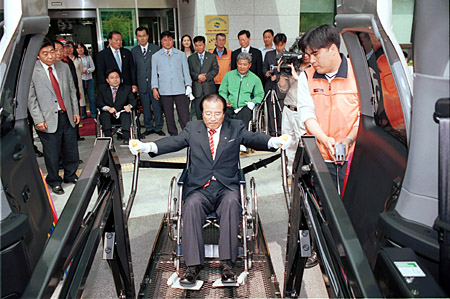 ÁßÁõÀå¾ÖÀÎ Äݼ¾ÅÍ¿¡¼ ¿î¿µÇÒ Â÷·®Àº µµ ÀÚü»ç¾÷À¸·Î Áö¿ø¹ÞÀº ÈÙü¾î¸®ÇÁÆ® ÀåÂø Â÷·®À¸·Î¼ ±âÁ¸ÀÇ ¸®ÇÁÆ® ÀåÂøÂ÷·®°ú´Â ´Þ¸® ÈÙü¾îÀå¾ÖÀÎÀÌ ¿À¸£°í ³»¸± ¶§ ¸Ó¸®¸¦ ¼÷ÀÏ Çʿ䰡 ¾øµµ·Ï Â÷ü¸¦ ³ô°Ô ¸¸µé¾î ÁßÁõÀå¾ÖÀεéÀÇ ±³ÅëÆíÀǻӸ¸ ¾Æ´Ï¶ó Àå¾ÖÀο¡ ´ëÇÑ ¹è·Á±îÁö °®Ãá Â÷·®ÀÌ´Ù.