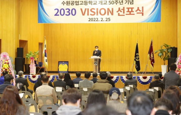 ÀåÇö±¹ ÀÇÀåÀº Ãà»ç¸¦ ÅëÇØ ¡°¿À´Ã ¼ö¿ø°ø°í´Â ºñÀü ¼±Æ÷½Ä¿¡¼ °³±³ ÀÌ·¡ Áö³ 50³âÀ» µÇµ¹¾Æº¸°í ´ÙÀ½ ¹é ³âÀ» ÇâÇÑ ºñÀüÀ» ¹ßÇ¥ÇÑ´Ù¡±¶ó¸ç ¡°¼ö¿ø°ø°í°¡ ¼ö¿ø°ú °æ±âµµÀÇ ÀÎÀç¾ç¼º¼ÒÀÌÀÚ ¸í¹® °ÅÁ¡Çб³·Î¼ ´ÙÀ½ ¹é³â¿¡µµ °è¼ÓÇØ¼ ¼ºÀåÇÒ ¼ö ÀÖµµ·Ï °æ±âµµÀÇȸ¿¡¼ ¸¹Àº ³ë·ÂÀ» ±â¿ïÀ̰ڴ١±¶ó°í ¸»Çß´Ù.
