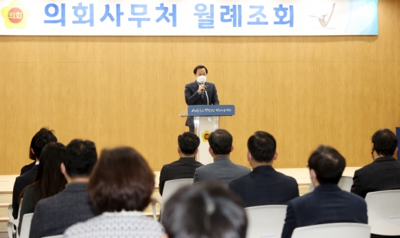 ÀåÇö±¹ ÀÇÀåÀº 2ÀÏ ¿ÀÀü ÀÇȸ»ç¹«Ã³ ´ëȸÀǽǿ¡¼ ¿¸° ¡®3¿ù ¿ù·ÊÁ¶È¸¡¯¿¡¼ ¡°´ëÅë·É ¼±°Å°¡ ¹Ù·Î ´ÙÀ½ ÁÖ¿¡ ÀÖ°í Áö¹æ¼±°Å ¿ª½Ã ¾ó¸¶ ³²Áö ¾Ê¾Ò´Ù¡±¶ó¸ç ¡°°øÁ÷Àڷμ Á¤Ä¡Àû Á߸³¼ºÀ» ¾ðÁ¦³ª À¯³äÇØ µÎ°í µµ¹ÎÀ» À§ÇÑ ÇàÁ¤¿¡ ÁýÁßÇØ¾ß ÇÒ °Í¡±À̶ó°í ÁÖ¹®Çß´Ù.