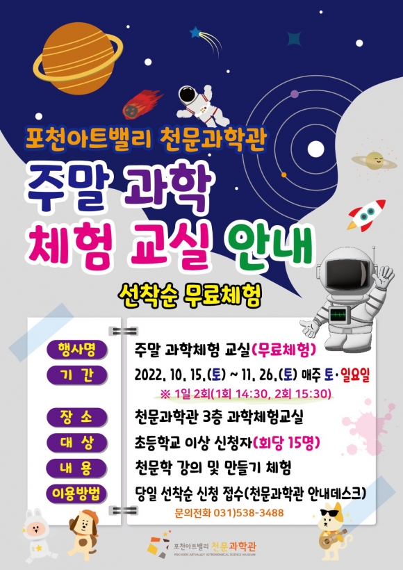 ÁÖ¸» °úÇÐüÇè±³½ÇÀº ½Ã¹ÎµéÀÇ Ãµ¹®°úÇÐ ÇÁ·Î±×·¥ ¿ä±¸¿¡ ºÎÀÀÇϰí Çб³³ª Àϻ󿡼 Á¢ÇÒ ¼ö ¾ø´Â Â÷º°ÈµÈ õ¹®°úÇÐ ÇÁ·Î±×·¥ üÇè ±âȸ¸¦ Á¦°øÇϱâ À§ÇØ ¸¶·ÃÇß´Ù.