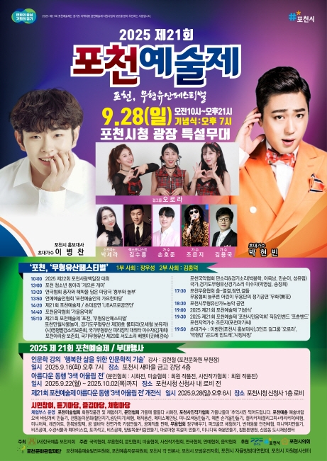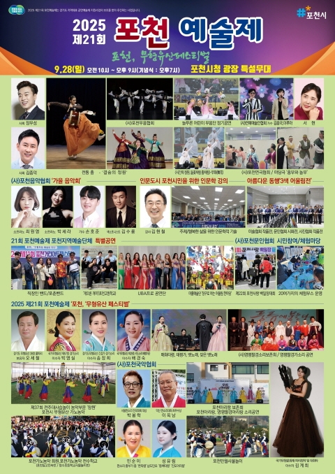 2025.9.28.(ÀÏ)Æ÷õ½Ãû ±¤Àå Æ¯¼³¹«´ë¿¡¼ ÁøÇàÇÏ´Â Æ÷õ¿¹¼úÁ¦´Â Æ÷õ¿¹ÃÑÀÌ ÁÖÃÖÇÏ°í Æ÷õ¿¹ÃÑ 8°³Çùȸ(±¹¾Ç,¹«¿ë,¹®ÀÎ,¹Ì¼ú,»çÁø,¿¬±Ø,¿¬¿¹,À½¾ÇÇùȸ)°¡ ÁÖ°üÇϸç, °æ±âµµ, Æ÷õ½Ã, Æ÷õ½ÃÀÇȸ°¡ ÈÄ¿øÇÏ´Â ´ëÇ¥ÀûÀÎ Á¾ÇÕ¹®È¿¹¼ú ÃàÁ¦·Î, ±¹¾Ç¡¤¹«¿ë¡¤¹®ÀΡ¤¹Ì¼ú¡¤»çÁø¡¤¿¬±Ø¡¤¿¬¿¹¡¤À½¾Ç µî ´Ù¾çÇÑ À帣ÀÇ ¿¹¼úÀΰú ½Ã¹ÎµéÀÌ ÇÔ²² ¾î¿ì·¯Áö´Â ¡®¿¹¼úÀÇ Å« ¸¶´çÃàÁ¦¡¯ÀÌ´Ù.