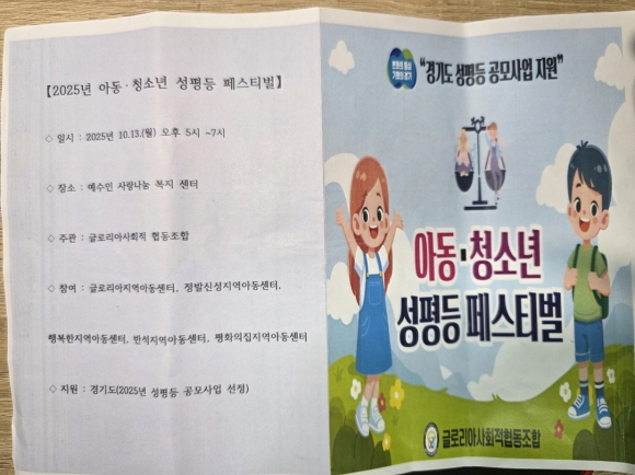°æ±âµµÀÇ 2025³â ¼ºÆòµî °ø¸ð»ç¾÷¿¡ ¼±Á¤µÈ ¡®¾Æµ¿¡¤Ã»¼Ò³â ¼ºÆòµî Æä½ºÆ¼¹ú¡¯ÀÌ Áö³ 10¿ù 13ÀÏ(¿ù) ¿ÀÈÄ 5½ÃºÎÅÍ 7½Ã±îÁö, ¿¹¼öÀλç¶û³ª´®º¹Áö¼¾ÅÍ¿¡¼ ¼ºÈ²¸®¿¡ °³ÃֵƴÙ.