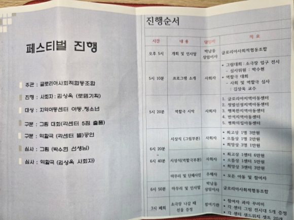 À̹ø Çà»ç´Â ±Û·Î¸®¾Æ»çȸÀûÇùµ¿Á¶ÇÕÀÌ ÁÖ°üÇϰí, ±Û·Î¸®¾Æ¡¤Á¤¹ß½Å¼º¡¤ÇູÇÑ¡¤¹Ý¼®¡¤ÆòÈÀÇÁý Áö¿ª¾Æµ¿¼¾ÅͰ¡ Âü¿©ÇÏ¿© ¾Æµ¿°ú û¼Ò³âÀÌ ÇÔ²² ¼ºÆòµîÀÇ Àǹ̸¦ ¹è¿ì°í üÇèÇÏ´Â ¶æ±íÀº ½Ã°£À» °¡Á³´Ù.