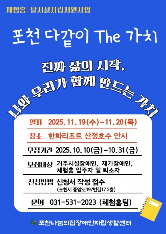 Æ÷õ³ª´®ÀÇÁýÀå¾ÖÀÎÀÚ¸³»ýȰ¼¾ÅÍ´Â ¡°Àå¾ÖÀÎÀÇ ÀÚ¸³Àº °³ÀÎÀÇ ¹®Á¦·Î¸¸ º¼ ¼ö ¾øÀ¸¸ç, ÁøÂ¥ »îÀÇ ½ÃÀÛÀº '³ª'ÀÇ µµÀü»Ó ¾Æ´Ï¶ó '¿ì¸®'ÀÇ ¿¬´ë¿¡¼ ºñ·ÔµÈ´Ù¡±°í ¹àÈ÷¸ç, À̹ø Á¦ 7ȸ ¡®Æ÷õ ´Ù °°ÀÌ The °¡Ä¡¡¯¸¦ ÅëÇØ Àå¾ÖÀÎÀÇ Áö¿ª»çȸ Âü¿©¿Í °øµ¿Ã¼Àû ¼ºÀåÀ» ½ÇÇöÇØ ³ª°¥ °èȹÀÌ´Ù.