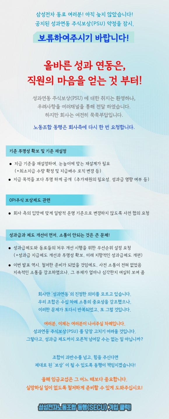 | »ï¼ºÀüÀÚ°¡ Áö³ 10¿ù 14ÀÏ ¹ßÇ¥ÇÑ »õ·Î¿î ¼º°úº¸»óÁ¦µµ ¡®¼º°ú¿¬µ¿Áֽ帻ó(PSU: Performance Share Unit)¡¯À» µÎ°í ³»ºÎ ¹Ý¹ßÀÌ È®»êµÇ°í ÀÖ´Ù. ȸ»ç ÃøÀº ¡°Àå±â¼º°ú¿Í ÁÖÁÖ°¡Ä¡¸¦ ³ôÀ̱â À§ÇÑ Á¦µµ¡±¶ó°í ¼³¸íÇßÁö¸¸, ³ëµ¿Á¶ÇÕÀº ¡°±âÁØÀÌ ºÒ¸íÈ®ÇÏ°í ¼ÒÅëÀÌ ºÎÁ·Çß´Ù¡±¸ç °ÇÏ°Ô ºñÆÇÇϰí ÀÖ´Ù.