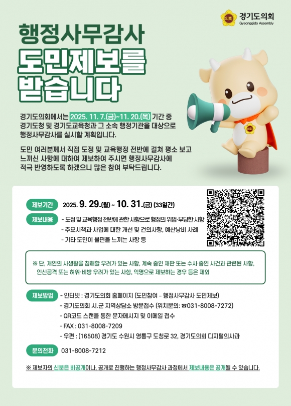 Á¦º¸ ¹æ¹ýÀº ¡â°æ±âµµÀÇȸ ȨÆäÀÌÁö(µµ¹ÎÂü¿© ¡æ ÇàÁ¤»ç¹«°¨»ç µµ¹ÎÁ¦º¸) ¿Â¶óÀÎ Á¢¼ö ¡âQRÄÚµå ½ºÄµÀ» ÅëÇÑ ¹®ÀÚ¸Þ½ÃÁö ¹× À̸ÞÀÏ(ggassembly15@gg.go.kr) Á¢¼ö ¡â°æ±âµµÀÇȸ 31°³ ½Ã¡¤±º Áö¿ª»ó´ã¼Ò ¹æ¹® Á¢¼ö ¡âÆÑ½º(031-8008-7209) ¡â¿ìÆí(°æ±âµµ ¼ö¿ø½Ã ¿µÅ뱸 µµÃ»·Î 32, °æ±âµµÀÇȸ µðÁöÅÐÀÇ»ç°ú) µî ´Ù¾çÇÏ´Ù. QRÄÚµå´Â °æ±âµµÀÇȸ ȨÆäÀÌÁö ¹× È«º¸ Æ÷½ºÅ͸¦ ÅëÇØ È®ÀÎÇÒ ¼ö ÀÖ´Ù.