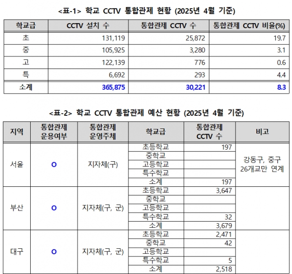 ÇÑÆí, ÁöÀÚü¿¡¼ Çб³ CCTV¸¦ ÅëÇÕ°üÁ¦ÇÒ ¼ö ÀÖµµ·Ï Çϰí, ±³À°ºÎ¿Í ±³À°Ã»ÀÇ ÇàÁ¤Àû¤ýÀçÁ¤Àû Áö¿øÀÌ °¡´ÉÇϵµ·Ï ÇÑ ¡¸ÃÊ¡¤ÁߵÀ°¹ý¡¹ °³Á¤¾ÈÀº 2025³â 3¿ù¿¡ ¹ßÀÇµÇ¾î ±¹È¸¿¡ °è·ù ÁßÀÌ´Ù.