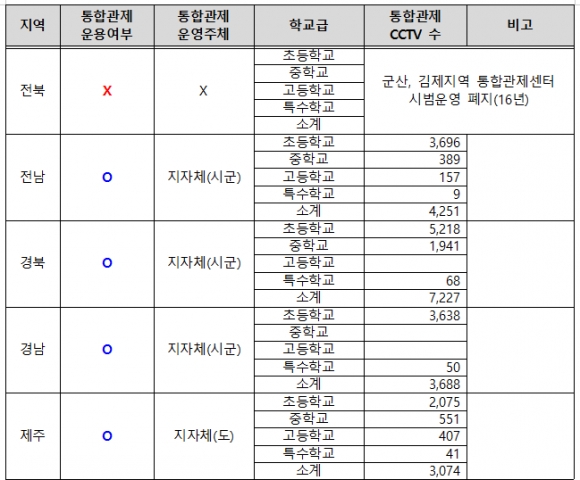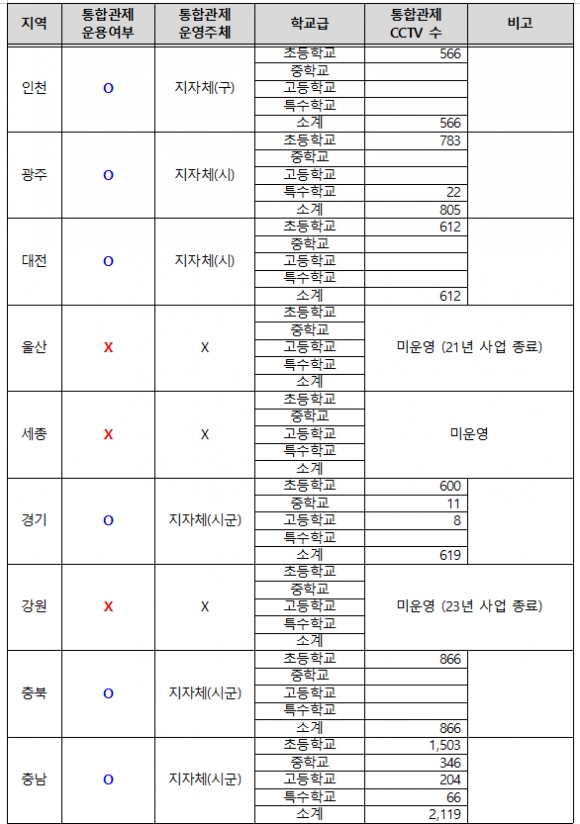 ¿ï»ê, ¼¼Á¾, °¿ø, ÀüºÏ Áö¿ª¿¡¼´Â ÁöÀÚü¿¡¼ Çб³ CCTV¸¦ ÅëÇÕ°üÁ¦ÇÏ´Â °÷Àº ¾ø´Â °ÍÀ¸·Î È®ÀεƴÙ.