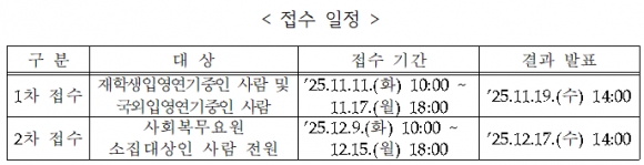 | °æ±âºÏºÎº´¹«Áöû(ÁöûÀå ¼Ò¿µ¸¸)Àº ¿À´Â 11ÀÏ(È)ºÎÅÍ ¡®26³âµµ »çȸº¹¹«¿ä¿ø ¼ÒÁý ½ÅûÀ» ½ÃÀÛÇÑ´Ù. 1Â÷ Á¢¼ö´Â ÀçÇлýÀÔ¿µ¿¬±âÀÚ¿Í ±¹¿ÜÀÔ¿µ¿¬±âÀÚ¸¦ ´ë»óÀ¸·Î Çϸç, 2Â÷ Á¢¼ö´Â 12¿ù 9ÀÏ(È)ºÎÅÍ »çȸº¹¹«¿ä¿ø ¼ÒÁý´ë»óÀÚ Àü¿øÀ» ´ë»óÀ¸·Î ÁøÇàÇÑ´Ù.