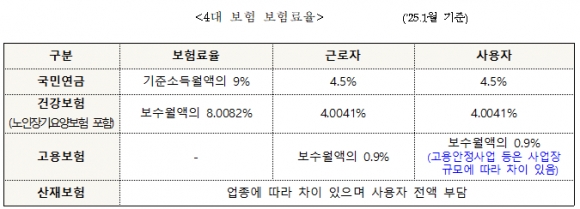 | ´ä) ±¹¹Î¿¬±Ý: ºñ°ú¼¼ ±Ý¾× Á¦¿Ü ÈÄ ±âÁؼҵæ¿ù¾×ÀÇ 9% °Ç°º¸Çè: ºñ°ú¼¼ ±Ý¾× Á¦¿Ü ÈÄ º¸¼ö¿ù¾×ÀÇ 8.0082%(³ëÀÎÀå±â¿ä¾çº¸Çè Æ÷ÇÔ) °í¿ëº¸Çè: ºñ°ú¼¼ ±Ý¾× Á¦¿Ü ÈÄ º¸¼ö¿ù¾×ÀÇ 1.8%(±Ù·ÎÀÚ 0.9%, ³ª¸ÓÁö »ç¿ëÀÚ ºÎ´ã) »êÀ纸Çè: Àü¾× »ç¿ëÀÚ ºÎ´ã 4´ë º¸ÇèÀº(±¹¹Î¿¬±Ý, °Ç°º¸Çè, °í¿ëº¸Çè, »êÀ纸Çè)Àº ³ëÈÄ, Áúº´, ½Ç¾÷, »ê¾÷ÀçÇØ µî ±¹¹ÎÀÇ ±âº»ÀûÀÎ »ýȰ º¸ÀåÀ» À§ÇØ ±¹°¡¿¡¼ ¿î¿µÇÏ´Â »çȸº¸ÇèÀ¸·Î, ±Ù·ÎÀÚ 1ÀÎ ÀÌ»ó »ç¾÷Àå¿¡ ±Ù·Î ½Ã Àǹ« °¡ÀÔÇØ¾ß ÇÏ¸ç ±âÁؼҵæ¿ù¾× µî¿¡ µû¶ó º¸Çè·á°¡ »êÁ¤µË´Ï´Ù.