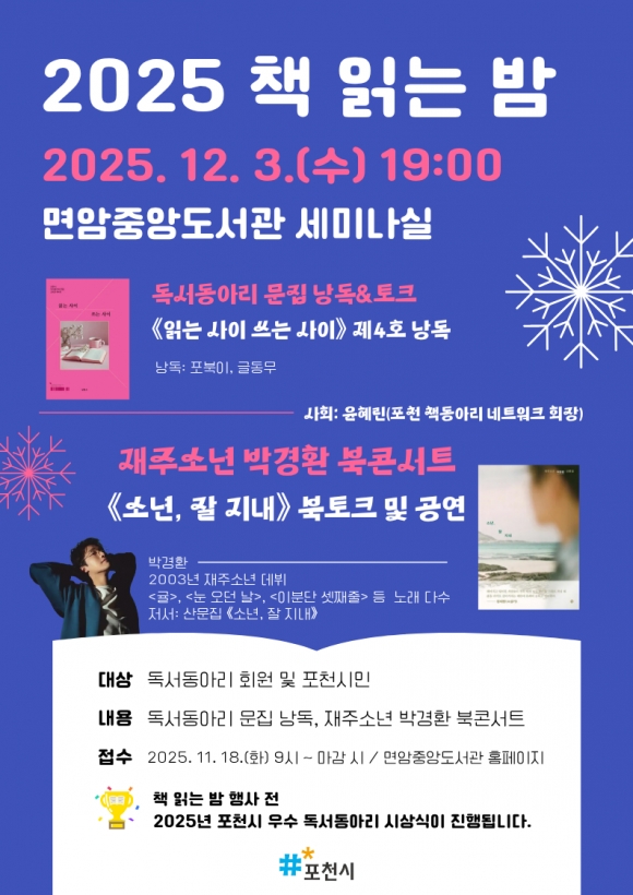 ¡®Ã¥ Àд ¹ã¡¯ Çà»ç´Â µ¶¼µ¿¾Æ¸® ȸ¿ø»Ó¸¸ ¾Æ´Ï¶ó Ã¥°ú µ¶¼ Ȱµ¿¿¡ °ü½É ÀÖ´Â ½Ã¹Î ´©±¸³ª Âü¿© °¡´ÉÇÑ ¿¸° Çà»ç´Ù. Âü°¡ ½Åû µî ÀÚ¼¼ÇÑ ³»¿ëÀº ¸é¾ÏÁß¾Óµµ¼°ü ´©¸®Áý(https://lib.pocheon.go.kr/center)¿¡¼ È®ÀÎÇÒ ¼ö ÀÖ´Ù.