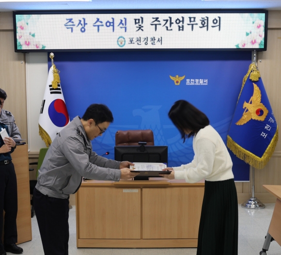 | Æ÷õ°æÂû¼(¼Àå ÇÑ»ó±¸)´Â, 1ÀÏ º¸À̽ºÇǽÌ(·Î¸Ç½º ÇǽÌ) ¹üÁË ¿¹¹æ¿¡ °áÁ¤ÀûÀÎ ±â¿©¸¦ ÇÑ 112½Å°í °ø·ÎÀÚ¿¡°Ô °¨»çÀå°ú ½Å°í Æ÷»ó±ÝÀ» ¼ö¿©Çß´Ù.