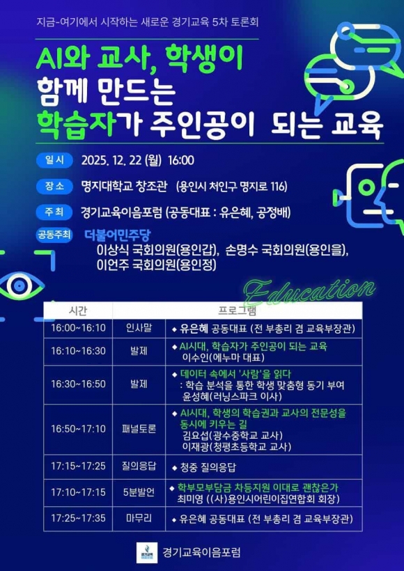 À̹ø Åä·Ðȸ´Â ¡®»ç¶÷ Áß½ÉÀÇ AI ±³À° Çõ½Å¡¯À» ÁÖÁ¦·Î, AI ±â¼úÀÌ °¡¼ÓȵǴ ȯ°æ ¼Ó¿¡¼ ±³»çÀÇ Àü¹®¼º¡¤ÇлýÀÇ ÀÚ±âÁÖµµ¼º¡¤ÇнÀ°æÇèÀÇ °³ÀÎȸ¦ ¾î¶»°Ô ±ÕÇü ÀÖ°Ô ±¸ÇöÇÒ °ÍÀÎÁö¸¦ ³íÀÇÇÏ´Â ÀÚ¸®·Î ¸¶·ÃµÈ´Ù. Çà»ç´Â ´õºÒ¾î¹ÎÁÖ´ç ÀÌ»ó½Ä ±¹È¸ÀÇ¿ø(¿ëÀΰ©), ¼Õ¸í¼ö ±¹È¸ÀÇ¿ø(¿ëÀÎÀ»), À̾ðÁÖ ±¹È¸ÀÇ¿ø(¿ëÀÎÁ¤)ÀÌ °øµ¿ÁÖÃÖÇÑ´Ù. À̼öÀÎ ¿¡´©¸¶ ´ëÇ¥´Â ¡®AI ½Ã´ë, ÇнÀÀÚ°¡ ÁÖÀΰøÀÌ µÇ´Â ±³À°¡¯À» ÁÖÁ¦·Î, ÀΰøÁö´ÉÀÌ ÇнÀÀÚÀÇ °³º° ¼Óµµ¿Í ³À̵µ¿¡ ¸ÂÃá ÇнÀÀ» °¡´ÉÇÏ°Ô ÇÏ¸ç ±³À° ºÒÆòµî ¿ÏÈ¿¡ ±â¿©ÇÒ ¼ö ÀÖ´Ù´Â °ßÇØ¸¦ Á¦½ÃÇÒ ¿¹Á¤ÀÌ´Ù. ±×´Â ¡°AI´Â ÇлýÀÇ °Á¡°ú ¾àÁ¡À» ½Ç½Ã°£À¸·Î ÆÄ¾ÇÇØ ÀÚ±âÁÖµµ ÇнÀÀ» µ½´Â °·ÂÇÑ µµ±¸¡±¶ó°í ¼³¸íÇϸç, ÇнÀÀÚ Áß½ÉÀÇ ¹Ì·¡±³À° ¸ðµ¨À» ¼Ò°³ÇÒ ¿¹Á¤ÀÌ´Ù.