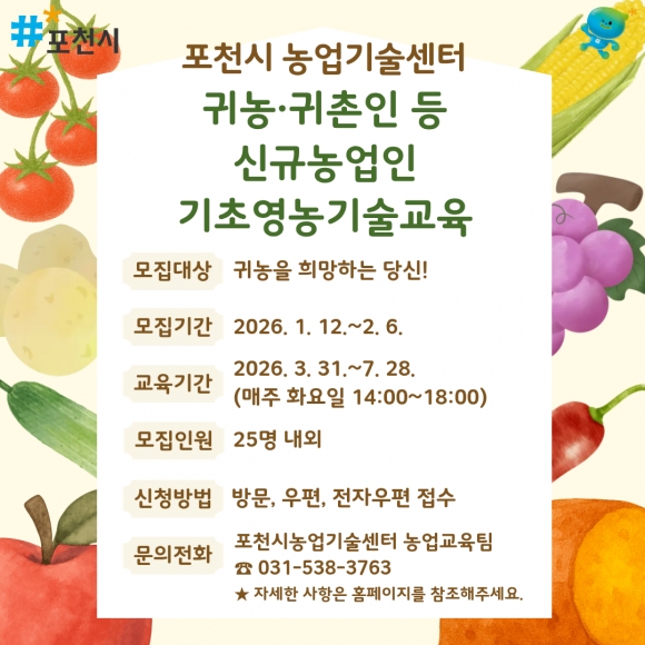 | Æ÷õ½Ã³ó¾÷±â¼ú¼¾ÅÍ 2026³â Æ÷õ½Ã ±Í³ó¡¤±ÍÃÌÀÎ µî ½Å±Ô³ó¾÷ÀÎ ±âÃÊ¿µ³ó±â¼ú±³À°¡¯ ±³À°»ýÀ» ¿À´Â 2¿ù 6ÀϱîÁö ¸ðÁýÇÑ´Ù.