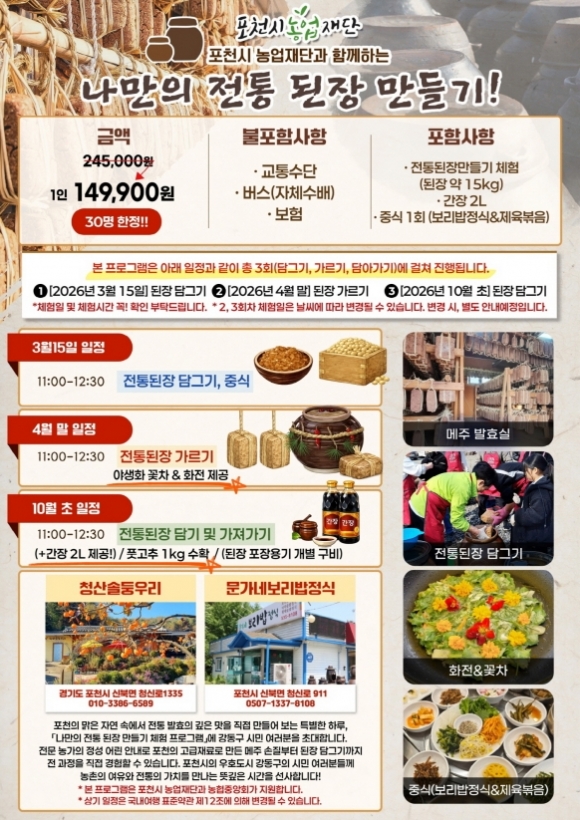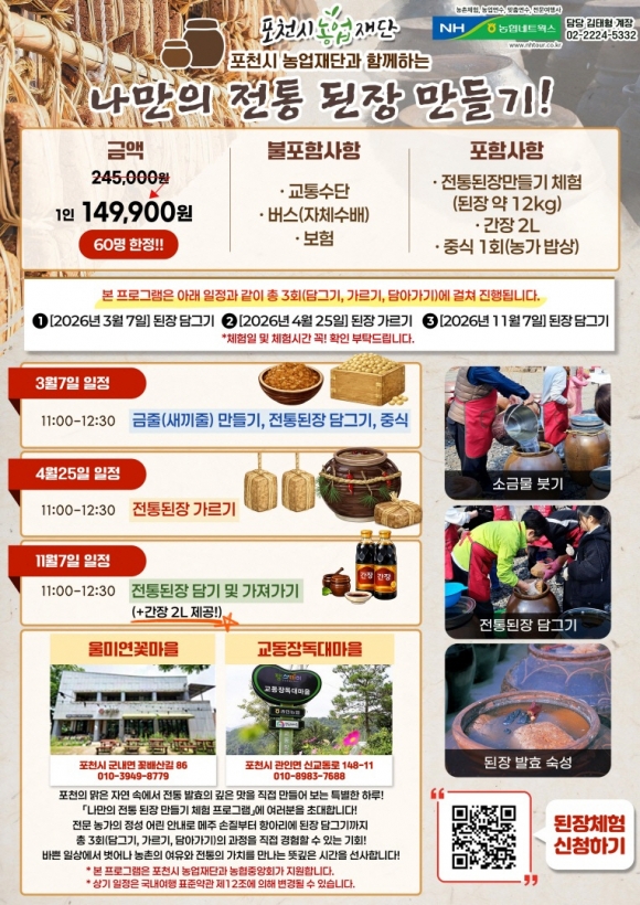 ◯ Æ÷õ½Ã³ó¾÷Àç´Ü, 2026³â ³óÃÌÀ¶º¹ÇÕ ±³·ù üÇéÁö¿ø»ç¾÷ ÀÏȯ µÈÀå ´ã±×±â ³óÃÌüÇè ÆÐŰÁö¿î¿µ - üÇè±â°£: 2026. 3.¡11.(3ȸ) - üÇèÀå¼Ò: 3°³¼Ò(û»ê¼ÖµÕ¿ì¸®, ±³µ¿Àåµ¶´ë¸¶À», ¿ï¹Ì¿¬²É¸¶À») - ½Åû´ë»ó: Æ÷õ½Ã¹Î µî üÇèÀ» Èñ¸ÁÇÏ´Â ÀÚ - üÇè³»¿ë: Æ÷õ½Ã Àå·ù üÇè³ó°¡¿Í ÇÔ²²ÇÏ´Â µµ³ó±³·ù üÇè - ½Åû±â°£: 2026. 2. 6.~2. 27.(üÇè³ó°¡º° ¼±Âø¼ø 30¸í, ¸ðÁý ¿Ï·á½Ã ½Åû±â°£ Á¾·á) * ´Ü, û»ê¼ÖµÕ¿ì¸®´Â ¿ìÈ£µµ½ÃÀÎ °µ¿±¸½Ã¹Î ´ë»ó ¿ì¼± ½Åû - ½Åû¹æ¹ý: ¿£¿¡ÀÌÄ¡(NH)³óÇù¿©Çà ´©¸®Áý ÂüÁ¶(https://www.nhtour.co.kr/nmall) - ±âŸ ¹®ÀÇ»çÇ×: Æ÷õ½Ã ³ó¾÷Àç´Ü(³óƯ»êÈ«º¸¸¶ÄÉÆÃÆÀ 031-538-6809)