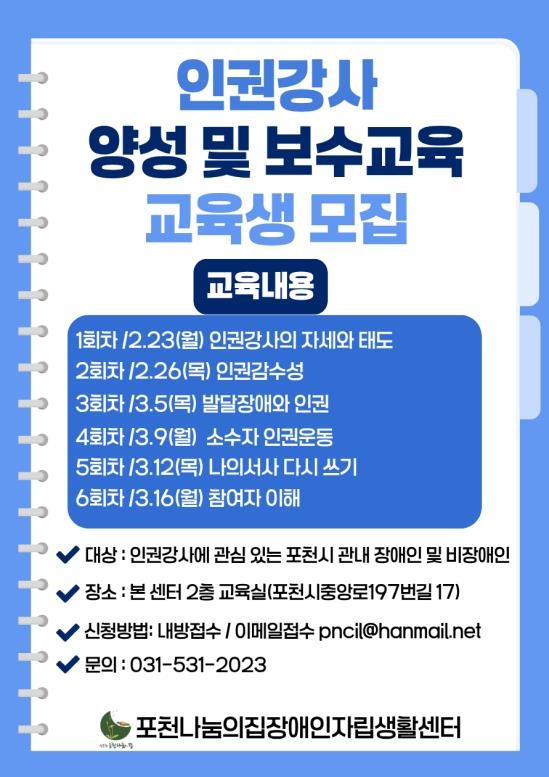 | Æ÷õ³ª´®ÀÇÁýÀå¾ÖÀÎÀÚ¸³»ýȰ¼¾ÅÍ´Â ¿À´Â 2¿ù 23ÀϺÎÅÍ 3¿ù 16ÀϱîÁö ÃÑ 6ȸ±â¿¡ °ÉÃÄ Àαǰ»ç ¾ç¼º ¹× º¸¼ö±³À°À» ÁøÇàÇÒ ¿¹Á¤ÀÌ´Ù. À̹ø À뱂 °»ç ¾ç¼º ¹× º¸¼ö ±³À°Àº Àαǰ»ç·Î¼ÀÇ Á¤Ã¼¼º°ú ¿Ã¹Ù¸¥ ŵµ¸¦ È®¸³Çϰí, Àå¾Ö ¹× ´Ù¾çÇÑ ¼Ò¼öÀÚ Àαǿ¡ ´ëÇÑ ÀÌ·ÐÀû ±â¹ÝÀ» È®ÀåÇÏ´Â °ÍÀ» ¸ñÇ¥·Î ÇÑ´Ù. ¶ÇÇÑ Âü¿©ÀÚÀÇ Àڱ⠰æÇèÀ» ¹ÙÅÁÀ¸·Î ÇÑ °ÀÇ ÁÖÁ¦ ¹ß±¼°ú ±³À° ÄÜÅÙÃ÷ ÀÛ¼º ¿ª·®À» °ÈÇϸç, ´Ù¾çÇÑ ±³À° ´ë»óÀÇ Æ¯¼º°ú ¼öÁØÀ» °í·ÁÇÑ ¸ÂÃãÇü ±³À° Á¢±Ù ´É·Â Çâ»ó¿¡ ÁßÁ¡À» µÎ°í ÀÖ´Ù.