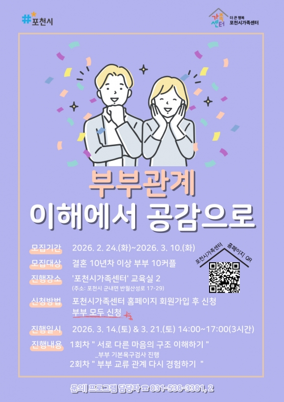¡á ¿î¿µ °³¿ä ⦁ÇÁ·Î±×·¥¸í: ºÎºÎ °ü°è ÀÌÇØ¿¡¼ °ø°¨À¸·Î ⦁´ë»ó: °áÈ¥ 10³â ÀÌ»ó ºÎºÎ 10½Ö ⦁¸ðÁý ±â°£: 2026. 2. 24.(È) ~ 3. 10.(È) 18:00 ⦁ÀÏÁ¤: 2026. 3. 14.(Åä), 3. 21.(Åä) 14:00~17:00 ⦁ºñ¿ë: ¹«·á ⦁Àå¼Ò: Æ÷õ½Ã°¡Á·¼¾ÅÍ ±³À°½Ç 2 (ÁÖ¼Ò: °æ±âµµ Æ÷õ½Ã ±º³»¸é ¹Ý¿ù»ê¼º·Î 17-29, Æ÷õ½Ã°¡Á·¼¾ÅÍ 2Ãþ) ⦁½Åû ¹× ¹®ÀÇ: 031-538-3381, 3382