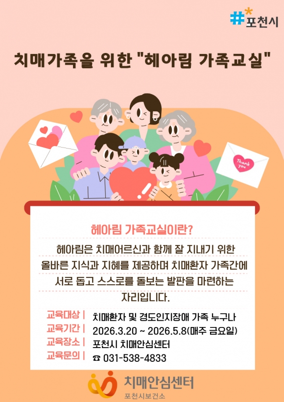 ¡®Çì¾Æ¸²¡¯ °¡Á·±³½ÇÀº Ä¡¸Å ¹× °æµµÀÎÁöÀå¾Ö ȯÀÚÀÇ °¡Á·°ú µ¹º½ÀÚ¶ó¸é ´©±¸³ª ½ÅûÇÒ ¼ö ÀÖÀ¸¸ç, ÀÚ¼¼ÇÑ »çÇ×Àº Æ÷õ½Ã Ä¡¸Å¾È½É¼¾ÅÍ(¢Ï031-538-4833)·Î ¹®ÀÇÇÏ¸é ¾È³»¹ÞÀ» ¼ö ÀÖ´Ù.