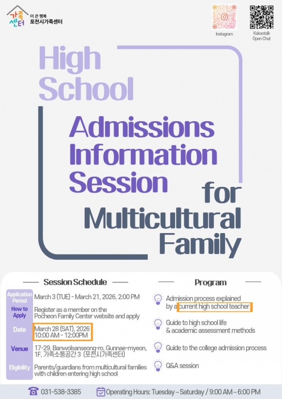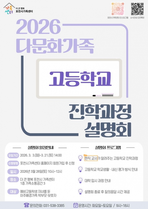 ¡á ¿î¿µ °³¿ä ⦁ÇÁ·Î±×·¥¸í: 2026 ´Ù¹®È°¡Á· °íµîÇб³ ÁøÇаúÁ¤ ¼³¸íȸ ⦁´ë»ó: ¿¹ºñ°íµîÇлý Àڳฦ µÐ Çкθ𡤺¸È£ÀÚ ⦁¸ðÁý ±â°£: 2026. 3. 3.(È) ~ 3. 21.(Åä) 14:00 ⦁ÀÏÁ¤: 2026. 3. 28.(Åä) ⦁½Ã°£: 10:00~12:00 ⦁ºñ¿ë: ¹«·á ⦁Àå¼Ò: Æ÷õ½Ã°¡Á·¼¾ÅÍ °¡Á·¼ÒÅë°ø°£3 (ÁÖ¼Ò: °æ±âµµ Æ÷õ½Ã ±º³»¸é ¹Ý¿ù»ê¼º·Î 17-29, Æ÷õ½Ã°¡Á·¼¾ÅÍ 1Ãþ) ⦁½Åû ¹× ¹®ÀÇ: 031-538-3385