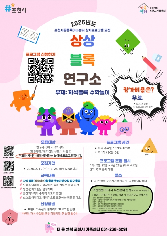 ¡á ¿î¿µ °³¿ä ⦁ÇÁ·Î±×·¥¸í: »ó»óºí·Ï¿¬±¸¼Ò ⦁´ë»ó: ¸¸2¼¼~3¼¼ ¾Æµ¿ ¹× º¸È£ÀÚ ⦁³»¿ë: ¸ÆÆ÷¸Ó½º(Magformers)¸¦ Ȱ¿ëÇÑ Ã¢ÀÇ ³îÀÌ È°µ¿ ⦁¸ðÁý: 2026³â 3¿ù °¡Á·¼¾ÅÍ È¨ÆäÀÌÁö¸¦ ÅëÇØ 1±â ¸ðÁý ½Åû ⦁ÀÏÁ¤: 2026. 3. 25.(¼ö)~4. 29.(¼ö) ⦁½Ã°£: 2026³â 3¿ù 1±â ¸ðÁý ⦁ºñ¿ë: ¹«·á ⦁Àå¼Ò: ´õ Å« Çູ Æ÷õ½Ã°¡Á·¼¾ÅÍ °øµ¿À°¾Æ³ª´®ÅÍ (ÁÖ¼Ò: °æ±âµµ Æ÷õ½Ã ±º³»¸é ¹Ý¿ù»ê¼º·Î 17-29, ´õ Å« Çູ Æ÷õ½Ã°¡Á·¼¾ÅÍ 1Ãþ) ⦁½Åû ¹× ¹®ÀÇ: ´õ Å« Çູ Æ÷õ½Ã°¡Á·¼¾ÅÍ °øµ¿À°¾Æ³ª´®ÅÍ 031-538-3291