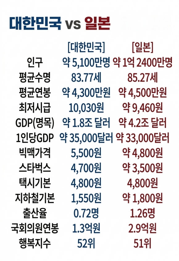 ±×·¯³ª ¹Ý¼¼±â°¡ È帥 2026³â ÇöÀç, ¿ì¸®´Â ¹Ï±â Èûµç ¼ýÀÚ¸¦ ¸¶ÁÖÇϰí ÀÖ´Ù. ÃÖ±Ù ¹ßÇ¥µÈ °¢Á¾ °æÁ¦ ÁöÇ¥¿Í »çȸ Åë°è´Â ´ëÇѹα¹ÀÌ ´õ ÀÌ»ó ÀϺ»ÀÇ µÚ¸¦ ÂÑ´Â Ãß°ÝÀÚ°¡ ¾Æ´ÔÀ» Áõ¸íÇÑ´Ù. 1Àδç GDP(±¹³»ÃÑ»ý»ê)¿¡¼ ÀÌ¹Ì Çѱ¹Àº ÀϺ»À» Ãß¿ùÇßÀ¸¸ç, ³ëµ¿ÀÇ °¡Ä¡¸¦ ´ëº¯ÇÏ´Â ÃÖÀú½Ã±Þ ¶ÇÇÑ ÀϺ»À» ¾ÕÁú·¶´Ù. °ú°Å ÀϺ»ÀÇ ºñ½Ñ ¹°°¡¸¦ º¸¸ç Çô¸¦ ³»µÑ·¶´ø ½ÃÀýÀÌ ¹«»öÇϰԵµ, ÀÌÁ¦´Â µµÄìÀÇ Ä¿Çǰª°ú ½Ä»çºñ°¡ ¼¿ïº¸´Ù Àú·ÅÇÏ´Ù´Â »ç½ÇÀÌ ³¸¼³Áö ¾Ê´Ù.