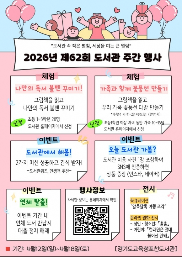 °¡Á·°ú ÇÔ²² Âü¿©ÇÒ ¼ö ÀÖ´Â À̹ø µµ¼°ü ÁÖ°£ Çà»ç´Â ÃÑ 7°³·Î ±¸¼ºµÈ´Ù. üÇè ÇÁ·Î±×·¥À¸·Î´Â <³ª¸¸ÀÇ µ¶¼ º¼Ææ ²Ù¹Ì±â>¿Í <°¡Á·°ú ÇÔ²² ²Édz¼± ¸¸µé±â> µî 2Á¾À¸·Î, ÃʵîÇб³ ÀúÇгâÀ» ´ë»óÀ¸·Î ±×¸²Ã¥°ú ¿¬°èÇÏ¿© °¢ÀÚÀÇ °³¼ºÀ» ´ãÀº µ¶¼ º¼ÆæÀ» Á÷Á¢ ²Ù¸çº¸´Â Ȱµ¿°ú, Ãʵî 1Çгâ ÀÌ»ó Àڳฦ Æ÷ÇÔÇÑ °¡Á· 10~15ÆÀÀÌ Âü¿©ÇÏ¿© ²Édz¼±À» ¸¸µé¸ç °¡Á·°ú ¼ÒÅëÇÏ´Â ÇÁ·Î±×·¥À¸·Î ÁøÇàµÉ ¿¹Á¤ÀÌ´Ù. üÇè ÇÁ·Î±×·¥Àº Æ÷õµµ¼°ü ȨÆäÀÌÁö¿¡¼ ¼±Âø¼øÀ¸·Î ¸ðÁýµÈ´Ù.