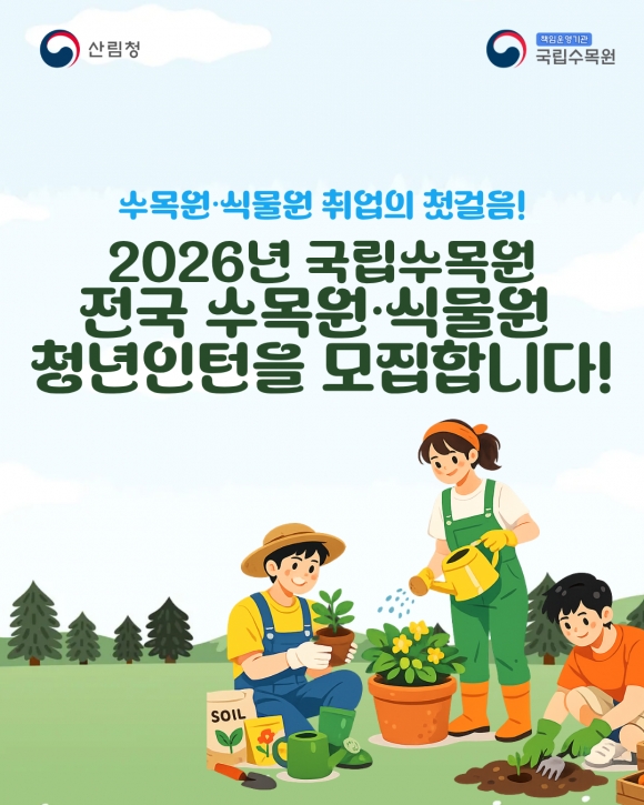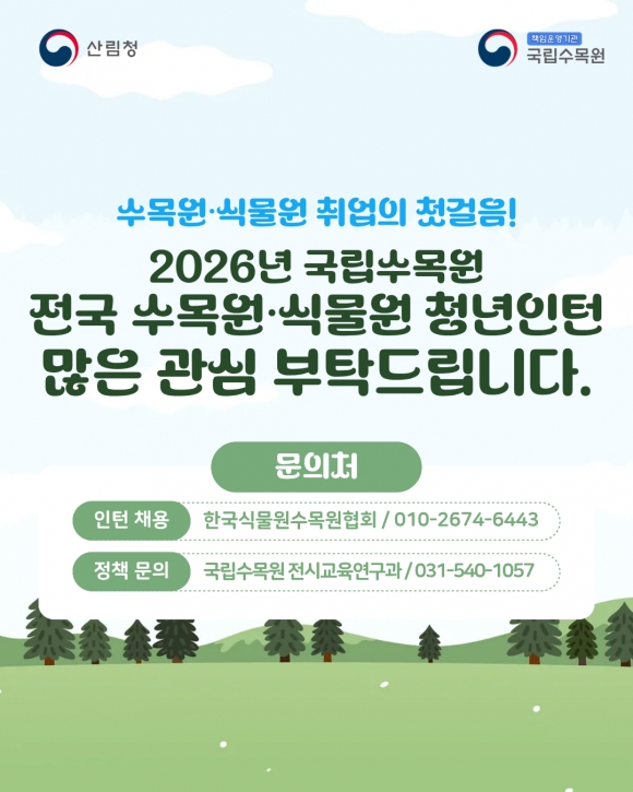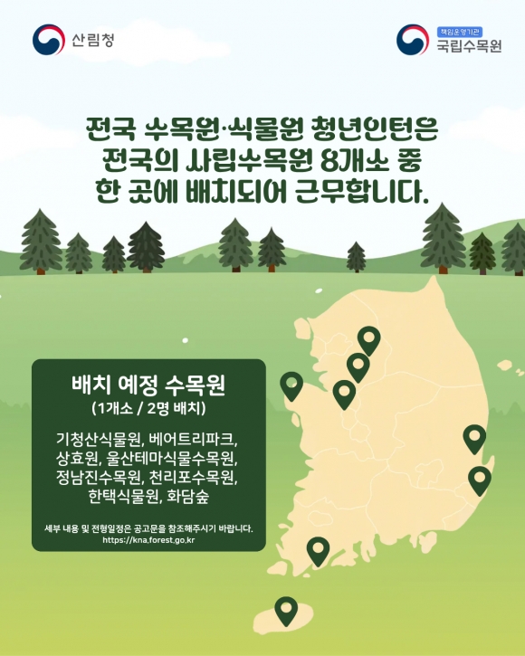 û³âÀÎÅÏÀº Àü±¹ ±Ç¿ªº° »ç¸³ ¼ö¸ñ¿ø¡¤½Ä¹°¿ø 8°³¼Ò¿¡ 2¸í¾¿ ¹èÄ¡µÈ´Ù. À̵éÀº ¾à 6°³¿ù°£ ¡ã±¹°¡ ¼ö¸ñÀ¯ÀüÀÚ¿ø DB °ü¸®, ¡ãÀü¹®Àü½Ã¿ø Á¶¼º ¹× ½ÄÀç»ó °ü¸®, ¡ã¼ö¸ñ¿ø¡¤½Ä¹°¿ø ºÐ¾ß ¹Ì·¡ÀÎÀç ¾ç¼º Á¤Ã¥ Âü¿© µîÀÇ ¾÷¹«¸¦ ´ã´çÇÒ ¿¹Á¤ÀÌ´Ù.