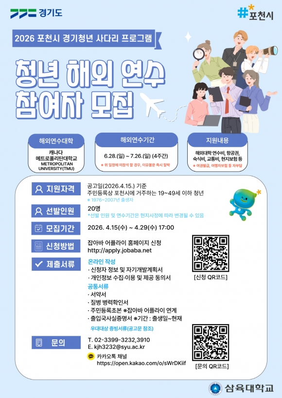 ½ÅûÀº Àâ¾Æ¹Ù ¾îÇöóÀÌ(https://apply.jobaba.net)¸¦ ÅëÇØ °¡´ÉÇϸç, ÀÚ¼¼ÇÑ »çÇ×Àº Æ÷õ½Ãû ȨÆäÀÌÁö ¡®»õ¼Ò½Ä¡¯À» È®ÀÎÇϰųª »ïÀ°´ëÇб³(¢Ï 02-3399-3233, 02-3399-3910, īī¿ÀÅå ä³Î 2026 Æ÷õ°æ±âû³â »ç´Ù¸®)¸¦ ÅëÇØ ¹®ÀÇÇÏ¸é µÈ´Ù.