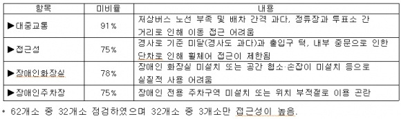 ƯÈ÷ ÀϺΠÅõÇ¥¼Ò¿¡¼­´Â À̵¿¾àÀÚÀÇ ÀÌ¿ëÀ» °í·ÁÇÏÁö ¾ÊÀº ±¸Á¶Àû ¹®Á¦°¡ È®ÀεƴÙ. Àå¾ÖÀÎ ÁÖÂ÷Àå Àαٿ¡ ÅÃ¹è º¸°üÇÔÀÌ ¼³Ä¡µÇ¾î ÀÖ¾î ÈÙü¾î ÀÌ¿ëÀÚÀÇ ½Â¡¤ÇÏÂ÷°¡ »ç½Ç»ó ¾î·Á¿î »óȲÀÌ ¹ß»ýÇϰí ÀÖ¾úÀ¸¸ç, Çб³¿¡ ¼³Ä¡µÈ ÅõÇ¥¼ÒÀÇ °æ¿ì Àå¾ÖÀÎ Àü¿ë ÁÖÂ÷ÀåÀÌ ¾Æ´Ñ ¿îµ¿Àå¿¡ ÁÖÂ÷Çϵµ·Ï ¾È³»µÇ¾î Á¢±Ù¼ºÀÌ Å©°Ô ÀúÇØµÇ´Â °ÍÀ¸·Î ³ªÅ¸³µ´Ù.