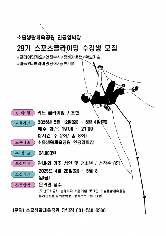 ½ºÆ÷Ã÷Ŭ¶óÀÌ¹Ö 29±â ¼ö°­À» Èñ¸ÁÇÏ´Â ½Ã¹ÎÀº 2026³â 4¿ù 28ÀϺÎÅÍ 5¿ù 8ÀϱîÁö Æ÷õµµ½Ã°ø»ç ȨÆäÀÌÁö¸¦ ÅëÇØ ½ÅûÇÒ ¼ö ÀÖÀ¸¸ç, ¼ö°­·á´Â 8¸¸ 4,000¿øÀÌ´Ù. Âü¿©ÀÚ´Â º°µµ Àåºñ ¾øÀÌ Æí¾ÈÇÑ º¹Àå°ú ¿îµ¿È­¸¦ Âø¿ëÇÏ¸é µÈ´Ù.