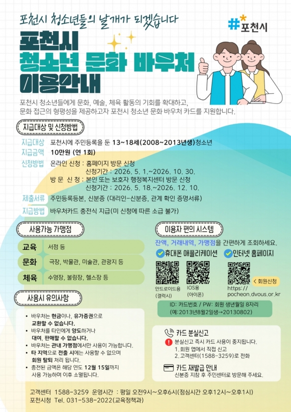 ½ÅûÀº ¿Â¶óÀΰú ¹æ¹® ¹æ½ÄÀ¸·Î °¡´ÉÇÏ´Ù. ¿Â¶óÀÎ ½ÅûÀº 2026³â 5¿ù 1ÀϺÎÅÍ 10¿ù 30ÀϱîÁö Æ÷õ½Ã û¼Ò³â ¹®È ¹Ù¿ìó ´©¸®Áý(https://pocheon.dvous.or.kr)¿¡¼ ÇÒ ¼ö ÀÖÀ¸¸ç, ¹æ¹® ½ÅûÀº 5¿ù 18ÀϺÎÅÍ 12¿ù 10ÀϱîÁö À¾¸éµ¿ ÇàÁ¤º¹Áö¼¾ÅÍ¿¡¼ ÇÏ¸é µÈ´Ù.